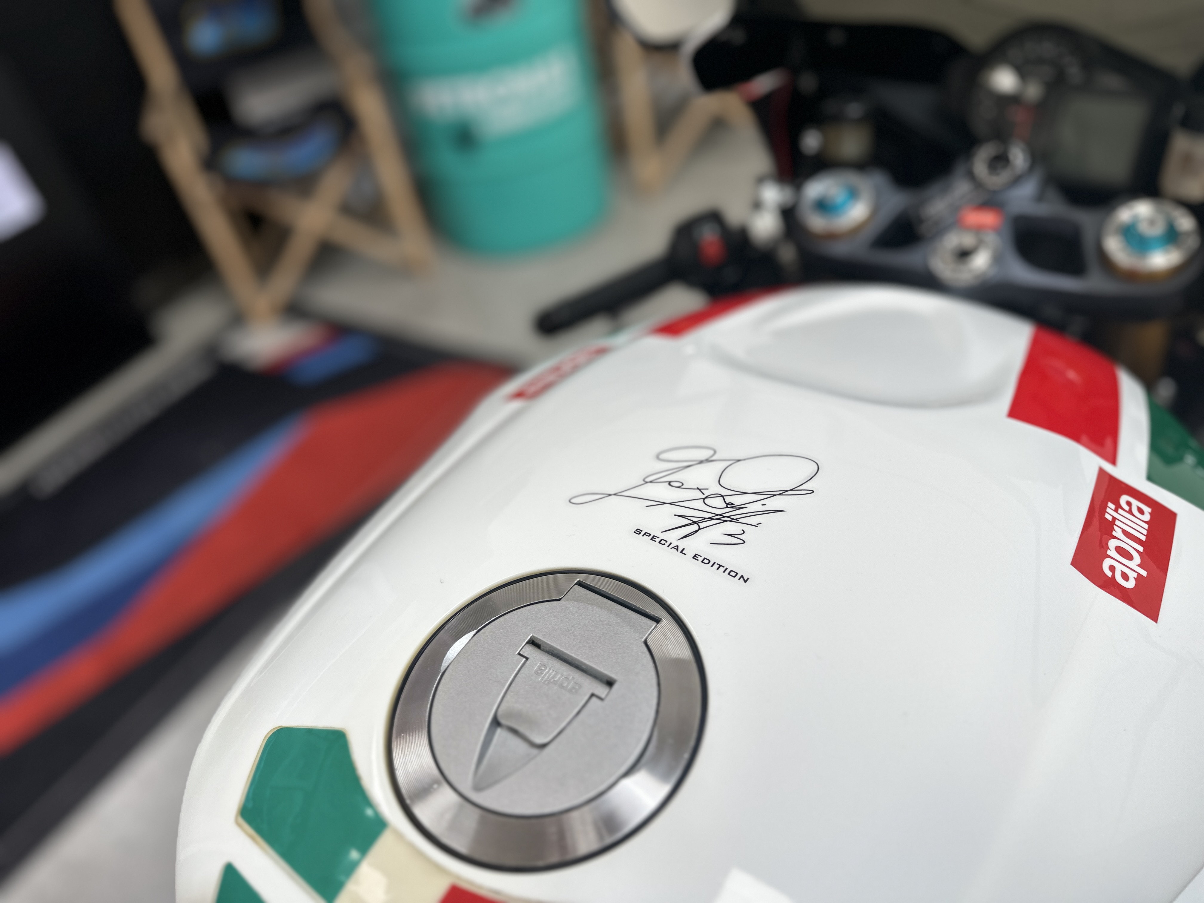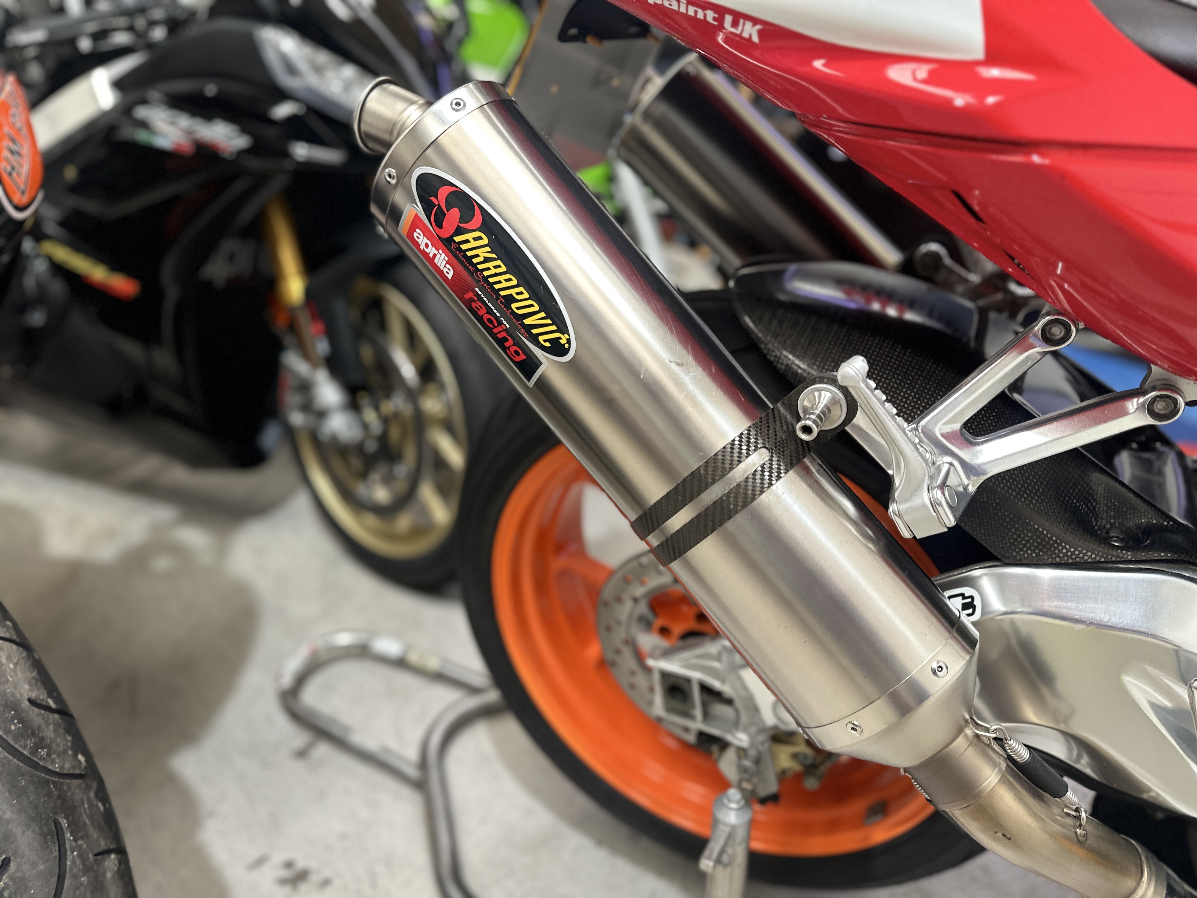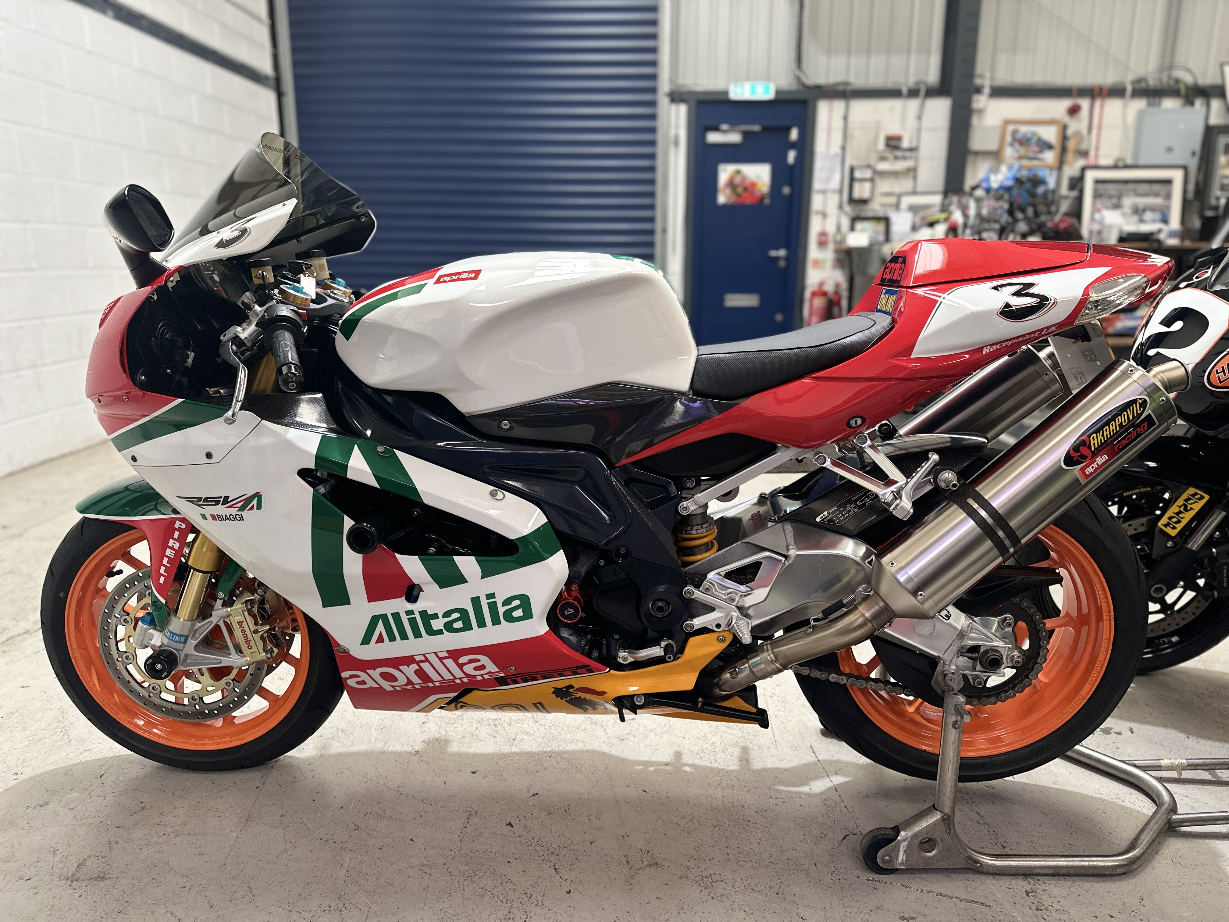 Akrapovic Exhaust System, Magnesium Engine Cases, Ohlins Forks, Ohlins Shock, Ohlins Steering Damper, Biaggi Special Edition Paint, Carbon Body Work Infills, Carbon Huggers, Upgraded Starter and Cables, Oberon Billet Slave Cylinder, Frame Crash Protection